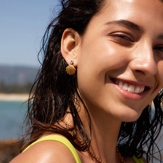 Stainless Steel CZ Ribbed Fan-shaped Shell Stud Earrings