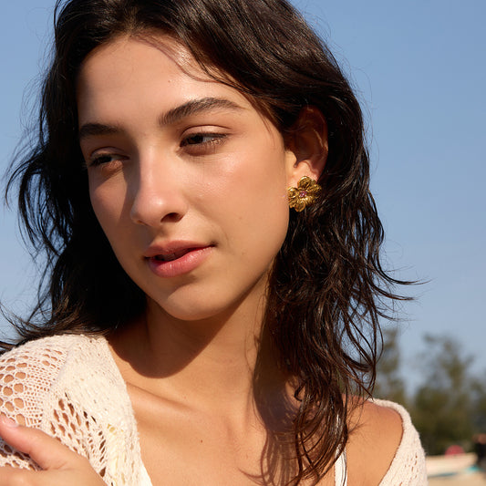 Stainless Steel Pink Cubic Zirconia Flower Stud Earrings