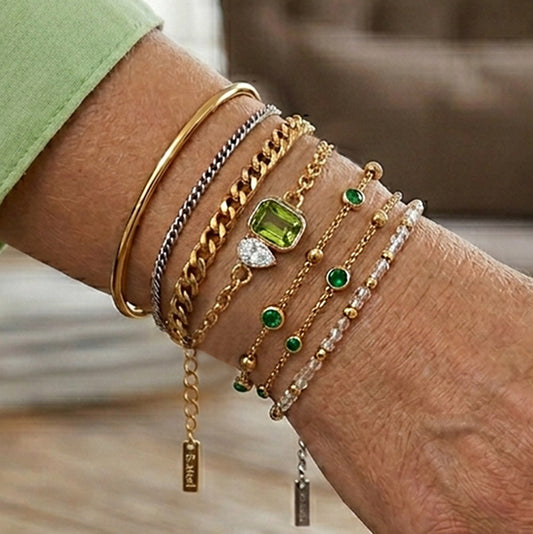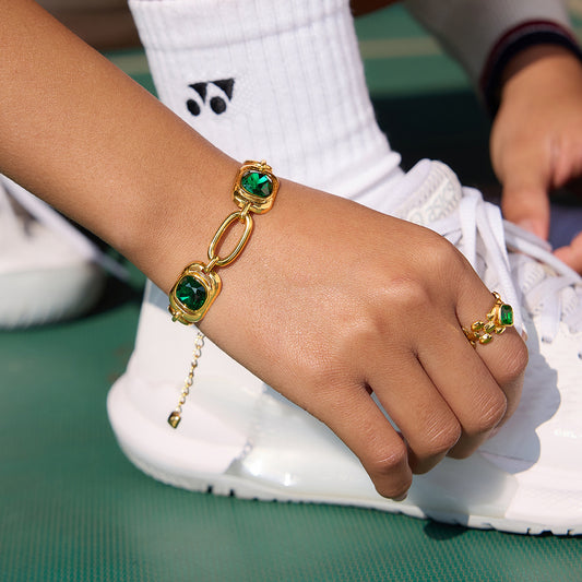 Stainless Steel Square Green Glass Thick Paperclip Chain Bracelet
