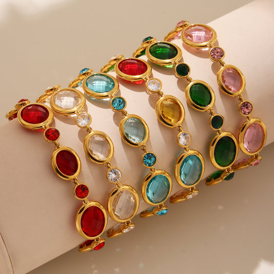 Stainless Steel 18K Gold PVD Oval Cut Crystal Glass Bracelet