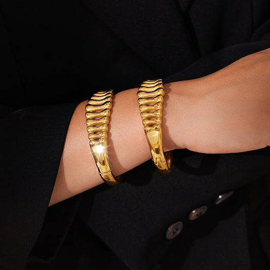 Stainless Steel Fishbone Texture Hollow Bangle Bracelet