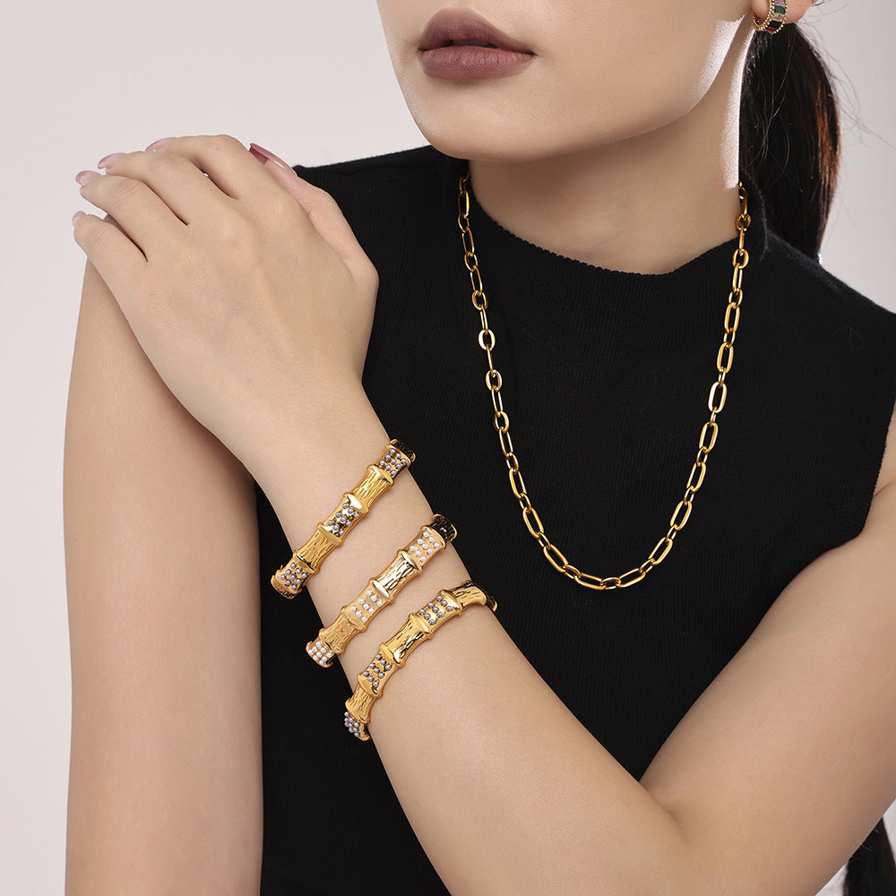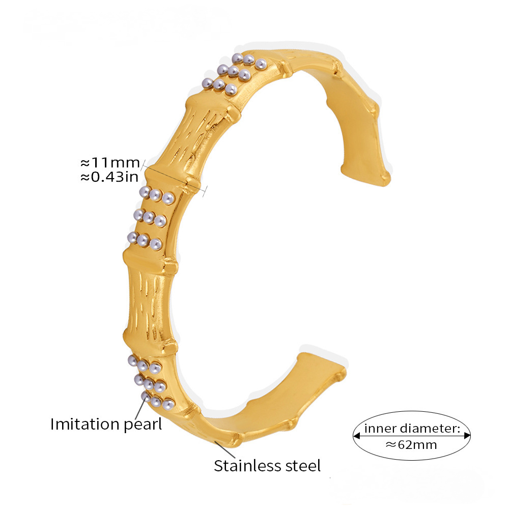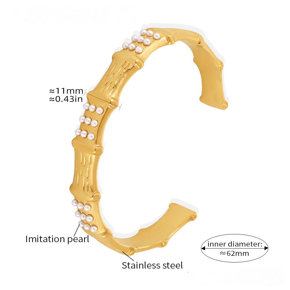 Stainless Steel Bamboo Shape Inlay Imitation Pearl Cuff Bracelet