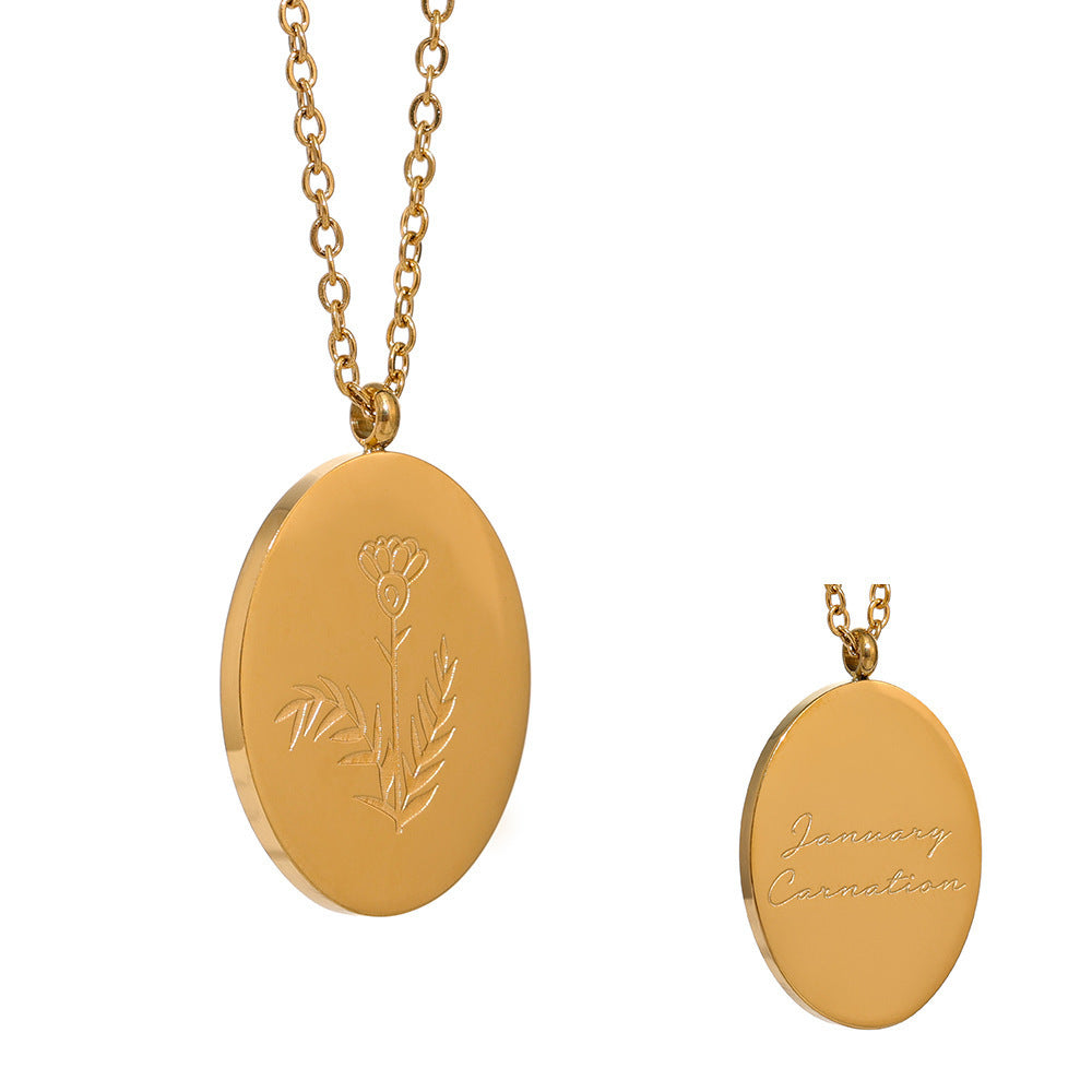 Stainless Steel Oval Birth Flower Pendant Necklace