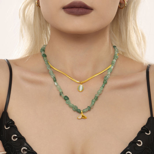 Stainless Steel Snake Chain Fishtail Pendant Natural Stone Beads Double Layer Necklace