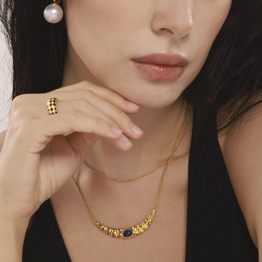 Crescent Moon Inlay Lapis Lazuli Double Necklace Imitation Pearl Earrings Jewelry Suit