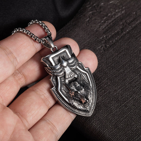 Collier avec pendentif en forme de bouclier et tête de loup en acier inoxydable