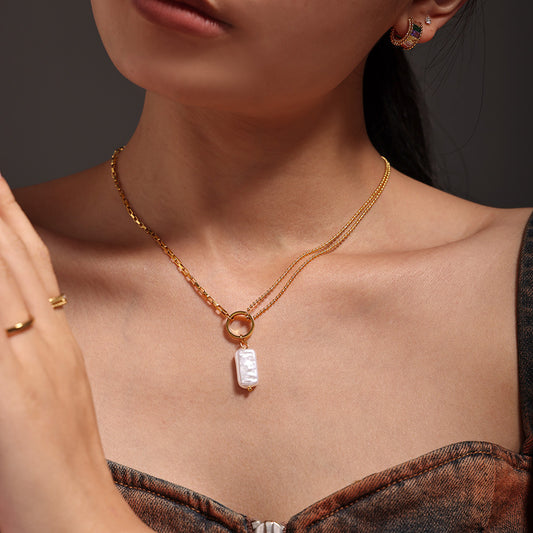 Collier de perles d'eau douce incrustées rectangulaires en acier inoxydable